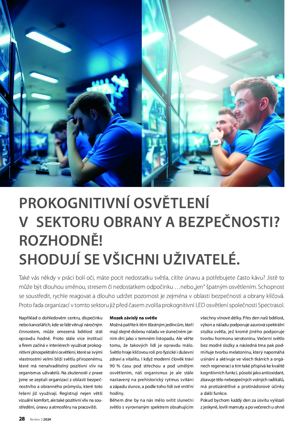 Také vás někdy v práci bolí oči, máte pocit nedostatku světla, cítíte únavu a potřebujete často kávu? Jistě to může být dlouhou směnou, stresem či nedostatkem odpočinku, nebo „jen“ špatným osvětlením. Schopnost se soustředit, rychle reagovat a dlouho udržet pozornost je zejména v oblasti bezpečnosti a obrany klíčová. Proto řada organizací v tomto sektoru již před časem zvolila prokognitivní LED osvětlení společnosti Spectrasol.