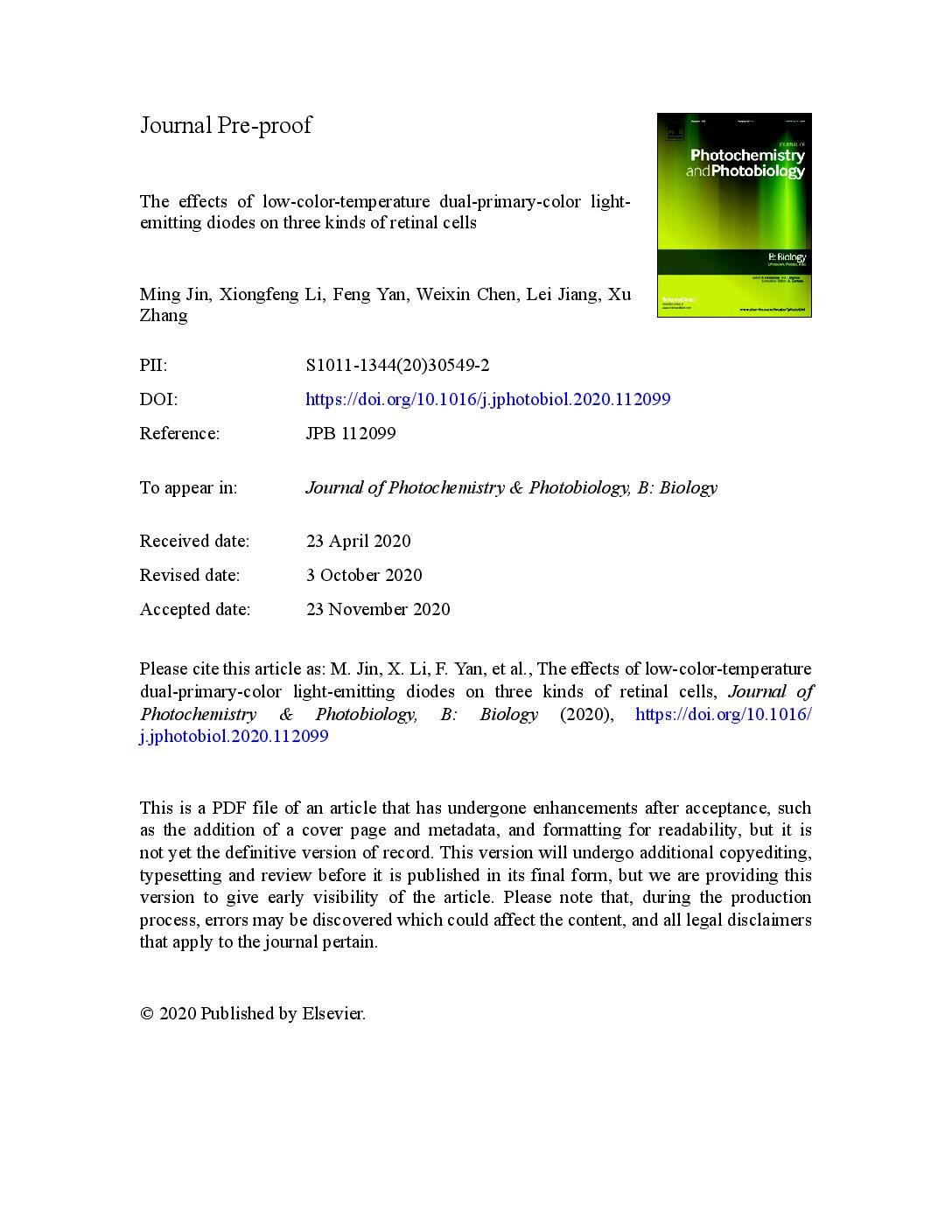 Výsledky výzkmumu čínského týmu vědců prokázaly, že dlouhodobé osvětlení sítnice LED diodami buzenými v modrém pásmu překrytém fosforem mohou způsobit zhoršení funkce sítnice i při malém obsahu modré složky. Předpokládá zároveň, že zdroje s nízkou CCT se stanou novým druhem zdravého světelného zdroje, protože nevyzařují modré světlo, nemají fosfor a řeší problém nízké účinnosti, s nímž se potýkají fosforem překryté LED zdroje s nízkou CCT. Mnoho studií naznačilo, že tyto nové zdroje s nízkou CCT pravděpodobně mají léčivé účinky. Dřív než budou tyto účinky studovány, je potřeba ověřit biologickou bezpečnost těchto nových LED zdrojů. Proto byl proveden tento experiment, aby se zjistily účinky nových sv. zdrojů s nízkou CCT a proti tomu běžných LED zdrojů bílého světla na třech druzích sítnicových buněk. Bylo pozorováno, že životaschopnost a počty sítnicových buněk se postupně snižovaly s rostoucí CCT. Nové LEDky s nízkou CCT způsobily méně mrtvých buněk a méně nepříznivý vliv na množení buněk než bílé LED. U buněk ARPE-19 byla po osvícení LEDkami s vysokou CCT snížená a místy přerušovaná exprese Zonula Occludens-1. U buněk R28 byla posílena tvorba stresového proteinu hemeoxygenázy a u buněk rMC-1 byla zvýšena tvorba gliového fibrilárního acidického proteinu a vimentinu. Z toho vyvozujeme, že nové LED zdroje téměř nepoškozují sitnicové buňky a snižují u člověka potenciální zdravotní rizika z chronického vystavení bílým LED zdrojům.
