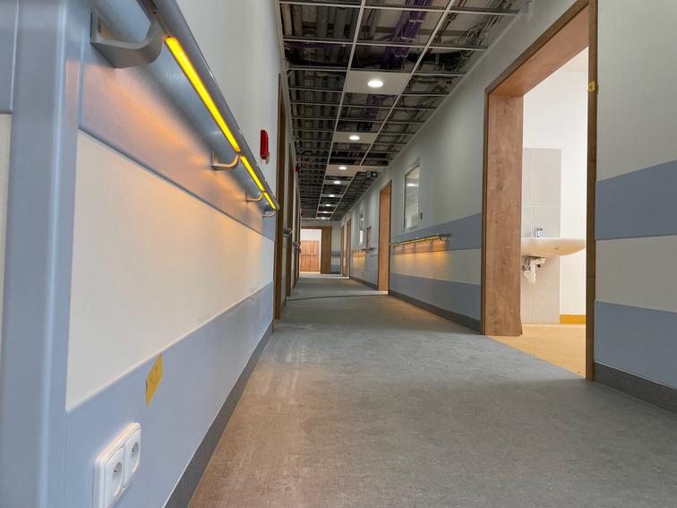 Noční orientační osvětlení chodeb Domova seniorů Sokolnice – instalace do zábradlí. Ani při nutném nočním pohybu klientů nedochází k narušování cirkadiánních rytmů organismu.