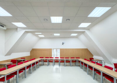 Pro osvětlení byla zvolena nepřímá lineární svítidla Spectrasol SunLine45, jež bylo třeba upravit na míru. Tělesa bylo třeba integrovat do atypických stropů historické budovy a speciálně navržených akustických prvků. Pro svítidla byl proto navržen a vyroben speciální náklopný systém.