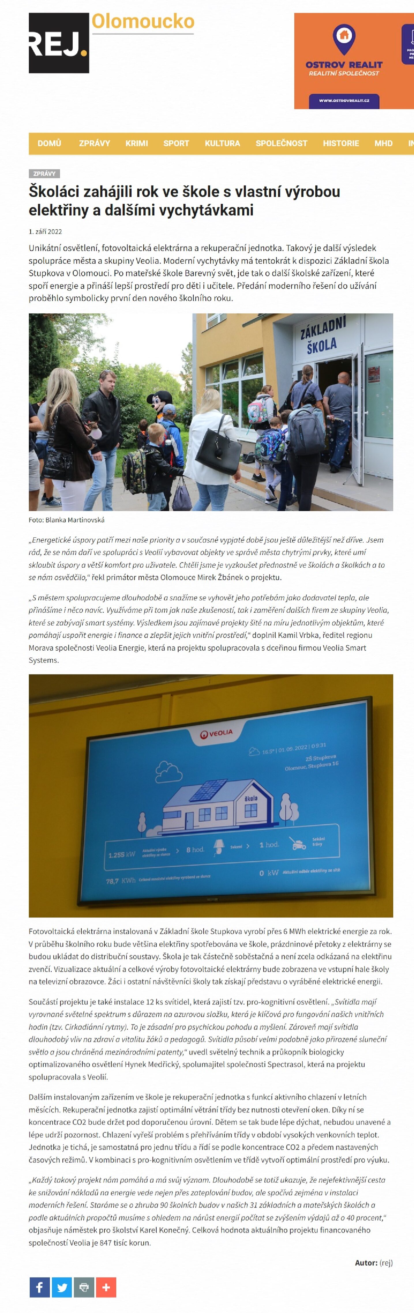 Unikátní osvětlení, fotovoltaická elektrárna a rekuperační jednotka. Takový je další výsledek spolupráce města a skupiny Veolia. Moderní vychytávky má tentokrát k dispozici Základní škola Stupkova v Olomouci. Po mateřské škole Barevný svět, jde tak o další školské zařízení, které spoří energie a přináší lepší prostředí pro děti i učitele. Předání moderního řešení do užívání proběhlo symbolicky první den nového školního roku.