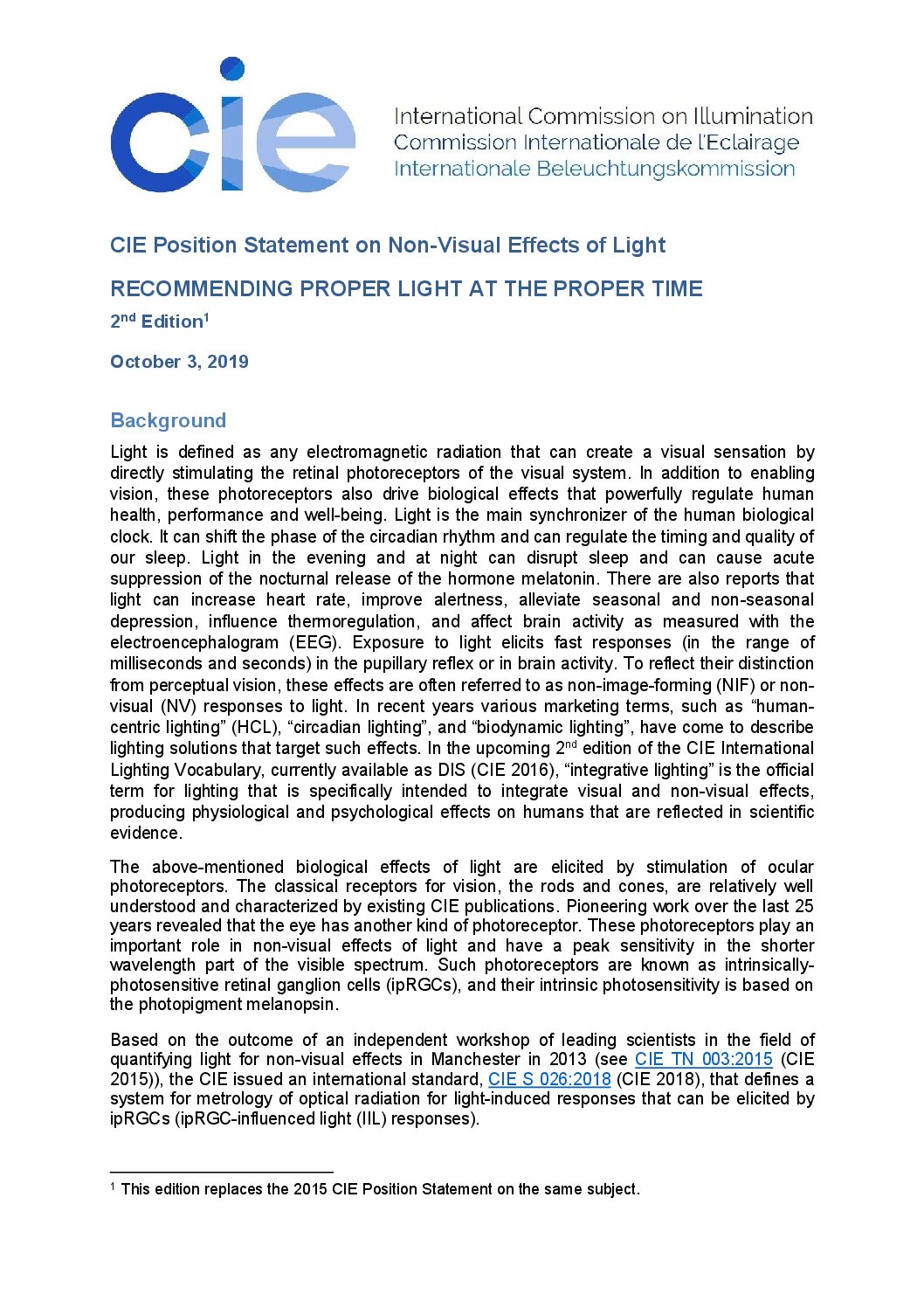 Stanovisko CIE (International Commission of Illumination) k ne-vizuálním efektům světla