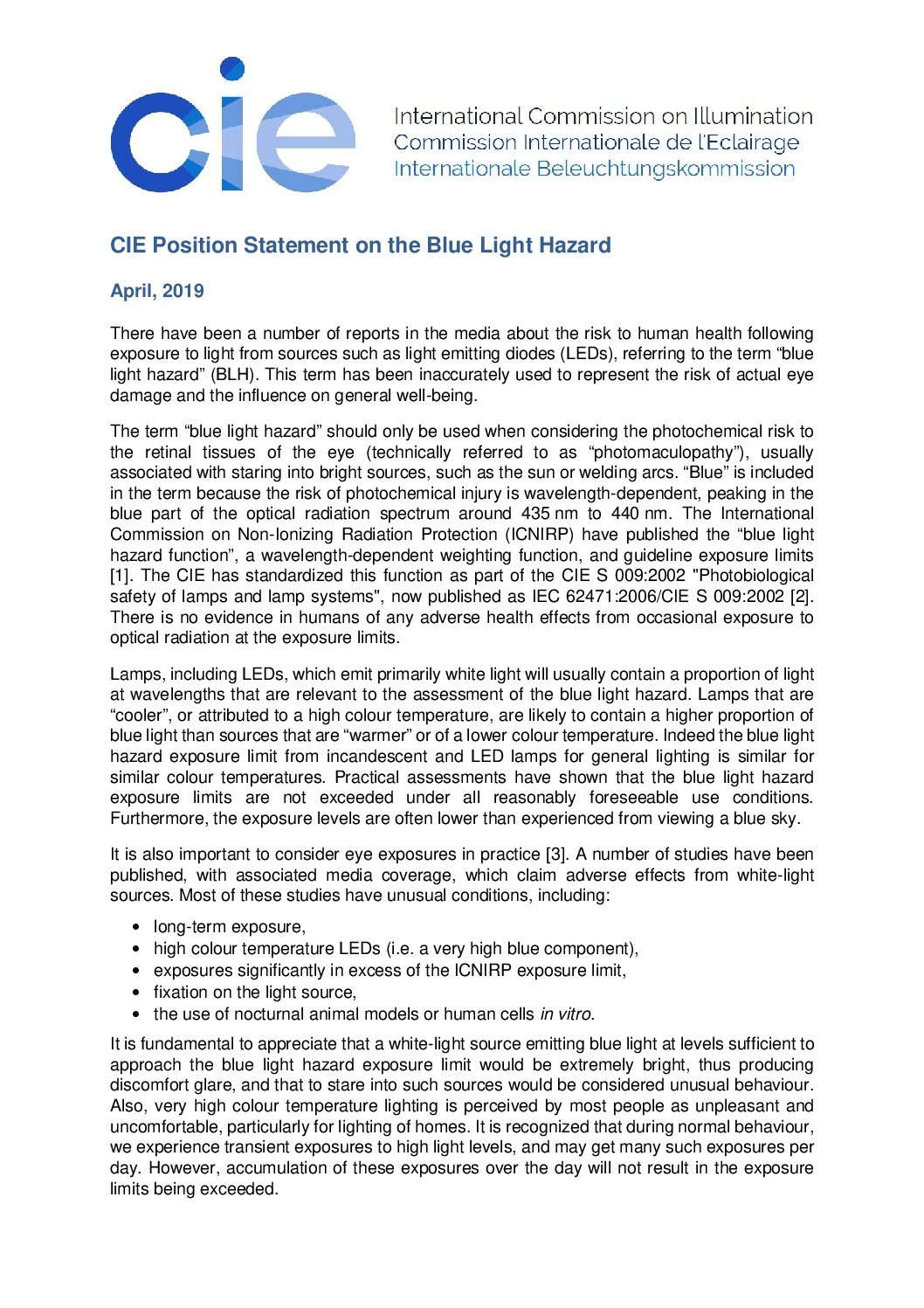 Stanovisko CIE (International Commission of Illumination) k rizikům blue light hazard efektu LED osvětlení (Harmful blue light).