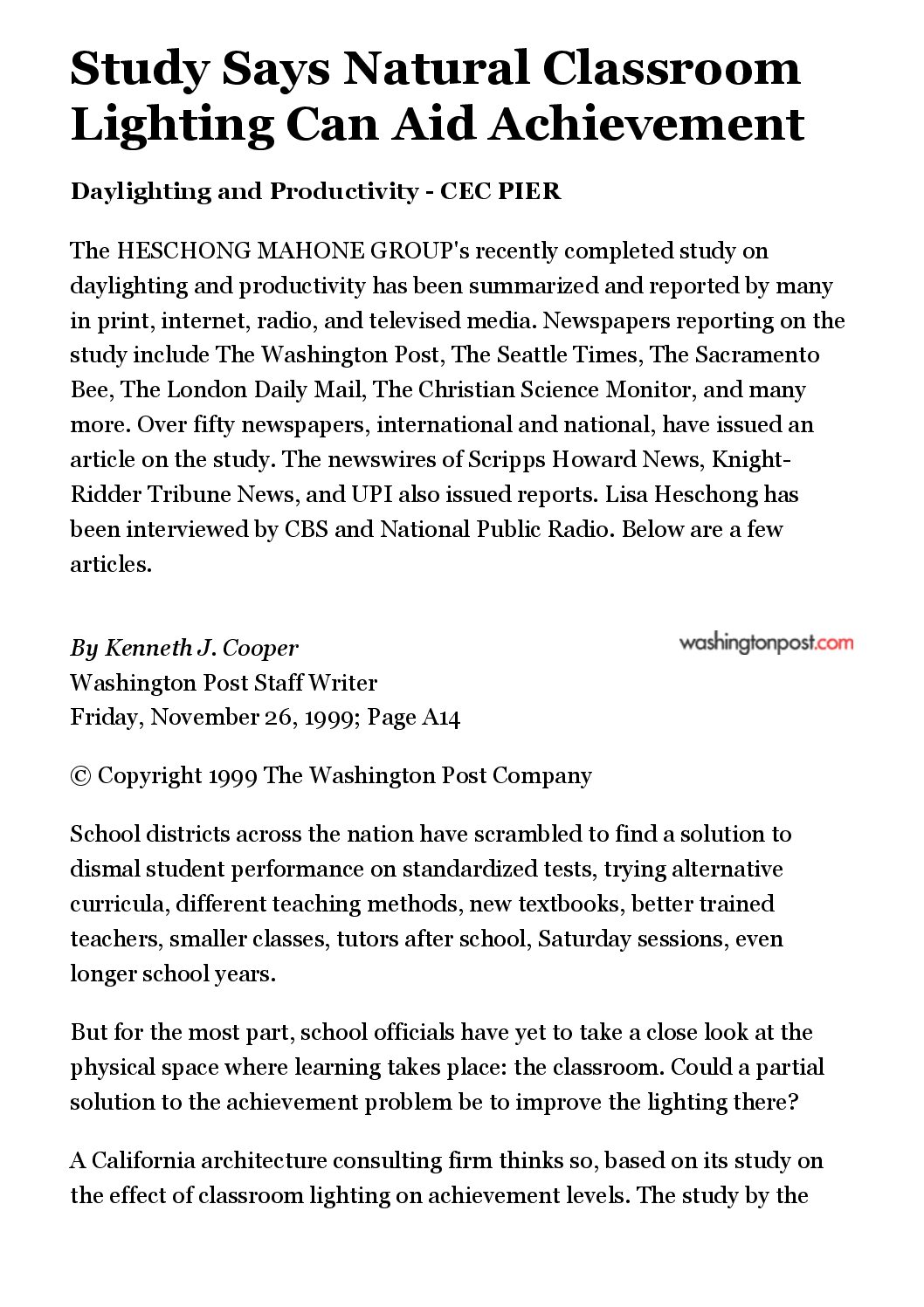 The HESCHONG MAHONE GROUP’s recently completed study on daylighting and productivity has been summarized and reported by many in print, internet, radio, and televised media. Newspapers reporting on the study include The Washington Post, The Seattle Times, The Sacramento Bee, The London Daily Mail, The Christian Science Monitor, and many more. Over fifty newspapers, international and national, have issued an article on the study. The newswires of Scripps Howard News, KnightRidder Tribune News, and UPI also issued reports. Lisa Heschong has been interviewed by CBS and National Public Radio. Below are a few articles.