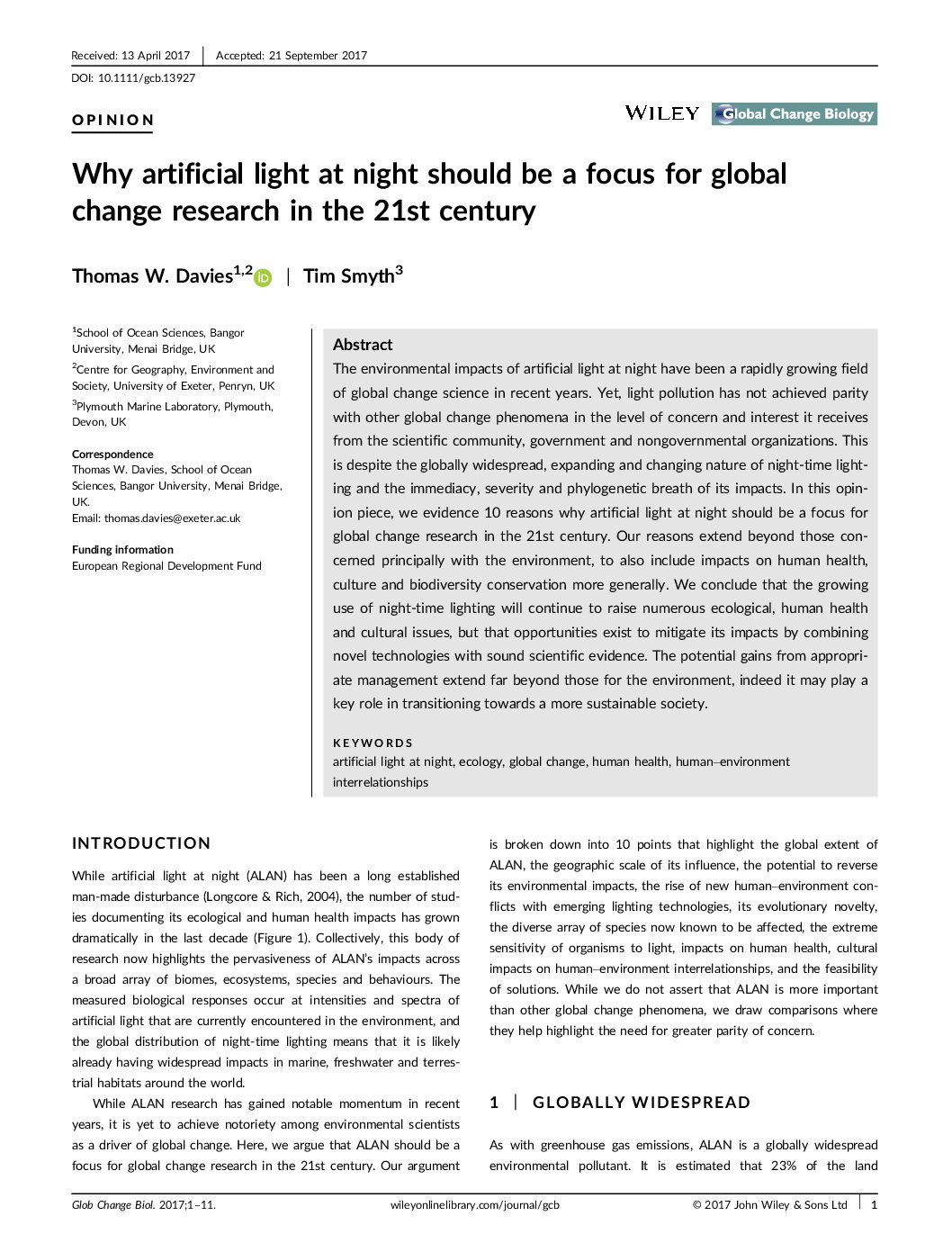 Abstract: The environmental impacts of artificial light at night have been a rapidly growing field of global change science in recent years. Yet, light pollution has not achieved parity with other global change phenomena in the level of concern and interest it receives from the scientific community, government and nongovernmental organizations. This is despite the globally widespread, expanding and changing nature of night-time lighting and the immediacy, severity and phylogenetic breath of its impacts. In this opinion piece, we evidence 10 reasons why artificial light at night should be a focus for global change research in the 21st century. Our reasons extend beyond those concerned principally with the environment, to also include impacts on human health, culture and biodiversity conservation more generally. We conclude that the growing use of night-time lighting will continue to raise numerous ecological, human health and cultural issues, but that opportunities exist to mitigate its impacts by combining novel technologies with sound scientific evidence. The potential gains from appropriate management extend far beyond those for the environment, indeed it may play a key role in transitioning towards a more sustainable society.